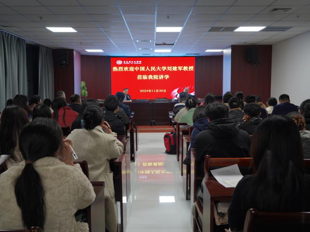 11月30日下午,全国知名专家,中国人民大学pg电子官方网站二级教授、博士生导师刘建军教授来我院讲学。讲学题目为“怎样研读重要讲话和撰写阐释论文”,讲座地点为明园校区3号楼A421会议室。我院院长胡运锋、副院长娄本东、副院长万晓飞、教科研骨干教师、部分青年教师代表、部分2024级硕士研究生代表参加报告会,报告会由孔国庆校长主持。