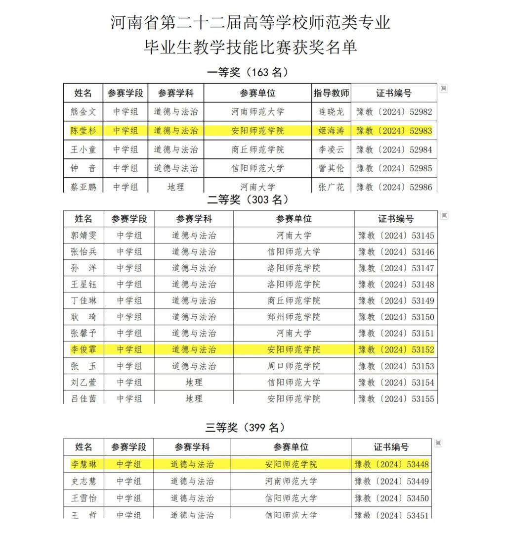今年,我院姬海涛老师指导的学生在河南省第二十二届高等学校师范类专业毕业生教学技能比赛中再获佳绩。陈莹杉、李俊霏和李慧琳三位同学分获道德与法治学科组一、二、三等奖。