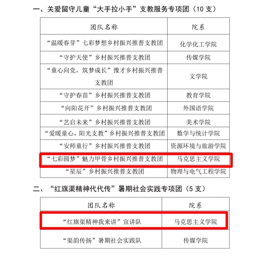 近日,共青团我校委员会发布关于2024年暑期社会实践校级专项团队立项的通知,我院“七彩圆梦”魅力甲骨乡村振兴推普支教团以及“红旗渠精神我来讲”宣讲队,成功入选校级团队立项。