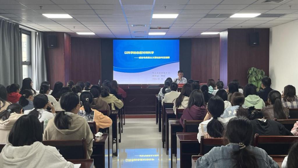 10月13日,华北水利水电大学社科处副处长、马克思主义研究中心主任杨国斌教授受邀来我院讲学。我院学生代表及部分思政课教师参加报告会。报告会分为上下两场,上午报告会的主题是“以科学的态度对待科学 ——试论马克思主义理论的守正创新”,由我院院长韩玉璞主持;下午报告会的主题是“青年教师科研能力的培养与提升”,由我院副院长胡运锋主持。
