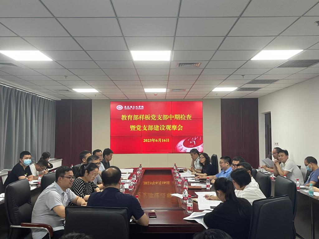 与会人员实地考察了教育部“样板支部”——我院教工第一党支部党员活动场所,仔细查阅了支部培育创建工作相关材料。党支部书记杨廷强汇报了“样板支部”建设情况并与与会人员就支部建设工作进行了沟通交流。