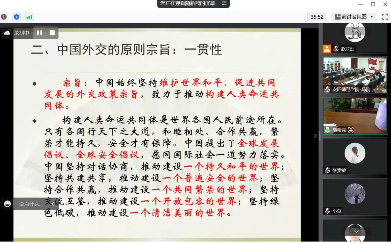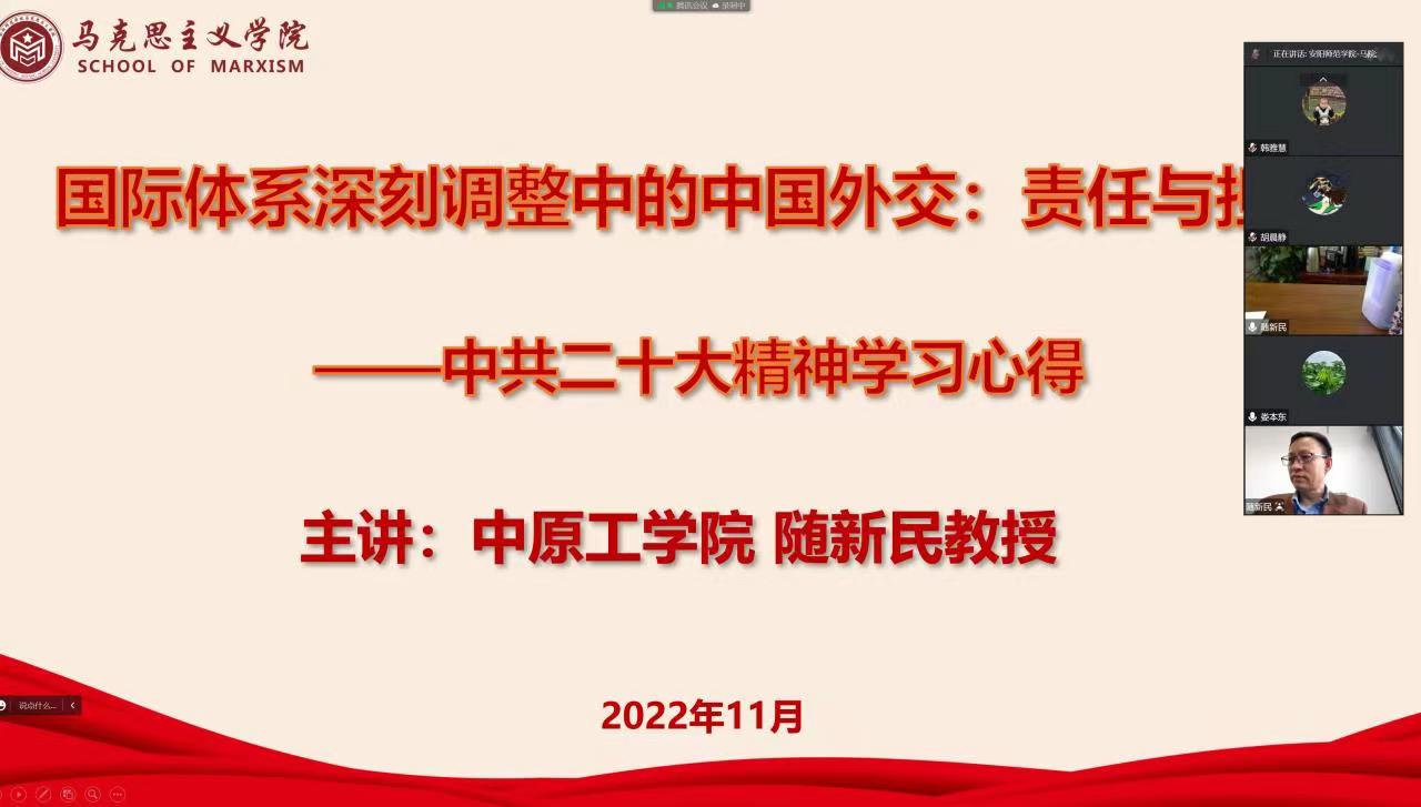 11月17日下午,中原工学院pg电子官方网站院长随新民教授应邀以腾讯会议方式作题为“国际关系深刻调整中的中国外交:责任与担当——中共二十大精神学习心得”专题报告。报告会由pg电子官方网站副院长胡运锋主持,pg电子官方网站部分师生参会。