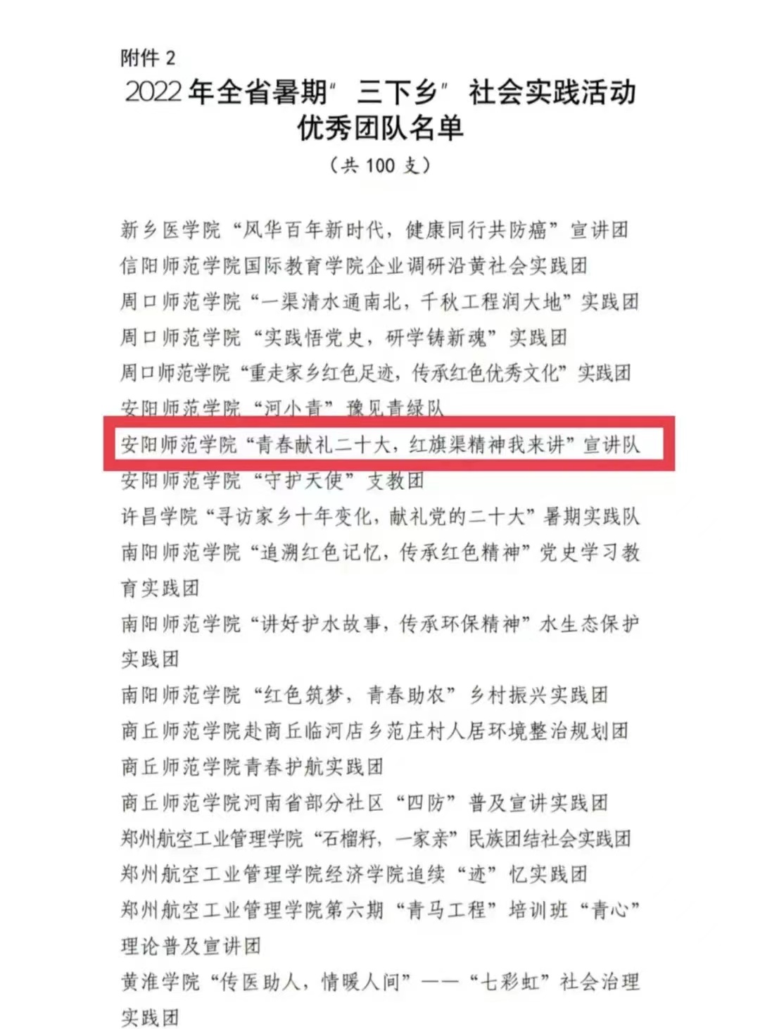 近日,由中央宣传部、中央文明办、教育部、共青团中央、全国学联共同举办的2022年全国大中专学生暑期“三下乡”社会实践活动中,我院“青春献礼二十大,红旗渠精神我来讲”宣讲队获评“全省社会实践优秀团队”。