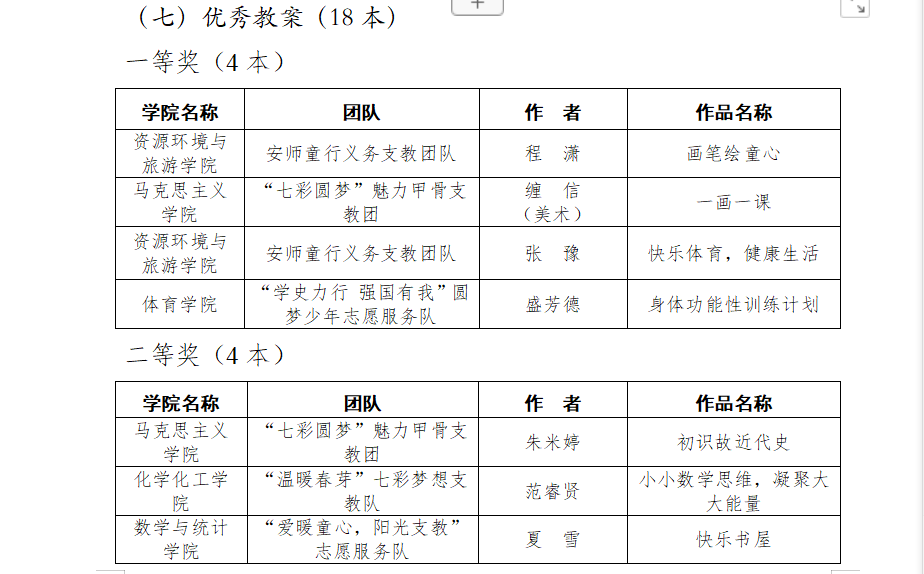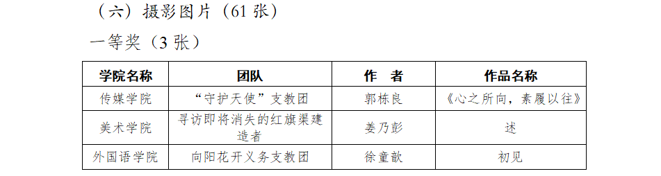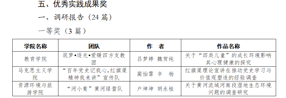 在优秀成果奖的评比中,蔺怡霏、辛杨的实践调研报告“红旗渠理论宣讲在推动党史学习与价值观塑造的经验调查”荣获一等奖;鲍婉佳的实践感悟征文“少年不惧夏日长,彼方尚有荣光在”荣获二等奖,郑嘉欣的实践感悟征文“传承红旗渠精神,凝聚筑梦正能量”、王丽华的实践感悟征文“少年不惧夏日长,彼方尚有荣光在”、丁晓慧的实践感悟征文“面对热爱,不留余力”荣获三等奖;梁亚迪的“代代有强音:音音余响,念念不忘”荣获日志评选活动一等奖,陈袁晨的‘“出征”动员’荣获日志评选活动二等奖;段静雯、朱米婷、丁晓慧“回放记录”荣获记录访谈活动三等奖;段静雯的“平凡的一天”荣获微视频评选活动一等奖;王吉的“传递”荣获摄影图片评选活动二等奖,杨乐的“欢聚颐天年”、韩佳玟的“红渠精神沁童心”荣获摄影图片活动三等奖;缠信的“一画一课”荣获优秀教案活动一等奖,朱米婷的“初识故近代史”荣获优秀教案活动二等奖。