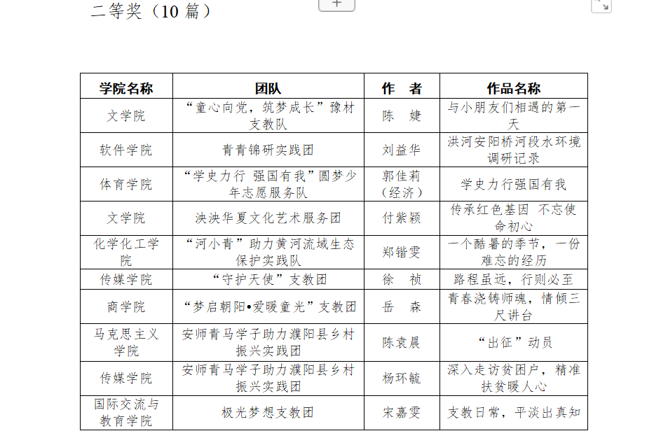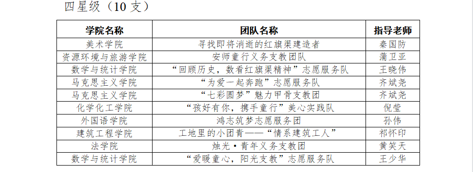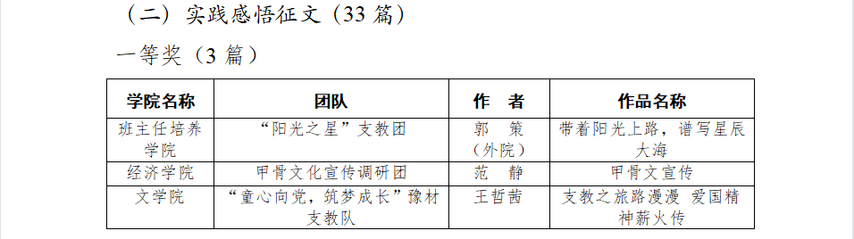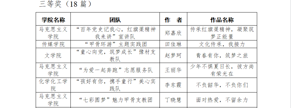一分耕耘,一份收获,我院实践团队凭借出色的团队协作能力荣获“先进集体标兵”称号,我院“百年党史记我心,红旗渠精神我来讲”宣讲队荣获五星级团队,“为爱一起奔跑”志愿服务队、“七彩圆梦”魅力甲骨支教团荣获四星级团队,齐斌尧老师荣获“优秀指导老师”称号。