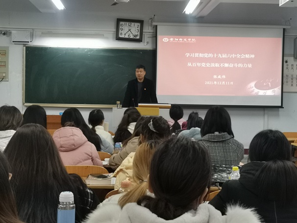 12月10日上午,我院党委书记张成伟在和鸣楼A205教室,为2019级学生作十九届六中全会精神专题报告。