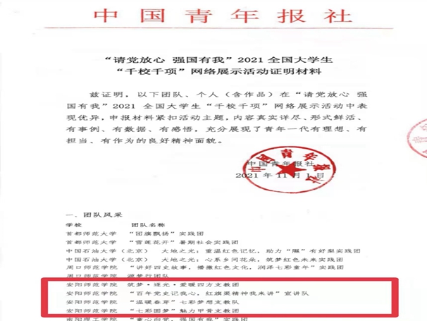 为深入学习宣传贯彻习近平总书记“七一”重要讲话精神,号召广大青年把个人的理想追求融入党和国家事业之中,让青春之花绽放在祖国最需要的地方。中国青年报社开展“请党放心 强国有我”2021全国大学生“千校千项”网络展示活动,近日获奖团队结果公布。我院“百年党史记我心,红旗渠精神我来讲”宣讲队和“七彩圆梦”魅力甲骨文支教团在此次活动中荣获团队风采奖。