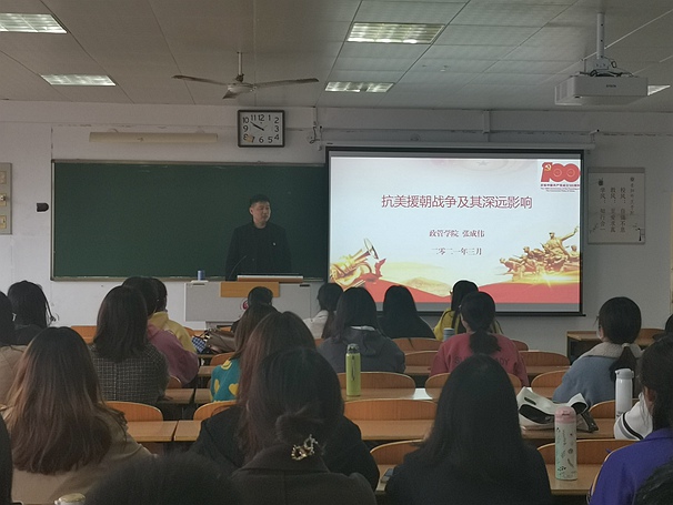 3月26日上午,我院党委书记张成伟在和鸣楼A501教室,为2019级学生上了一堂题为《抗美援朝战争及其深远影响》的思政课。