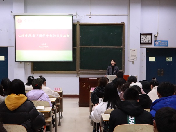12月21日晚,我院2020年团学骨干培训班暨第二十一期业余团校在和展阶梯203教室召开。我院党委副书记王海霞以“心理学视角下团学干部的成长路径”为题,为团学骨干作专题辅导。党建办、分团委、学生会、社联分会全体成员及19、20级班委聆听此次报告会。