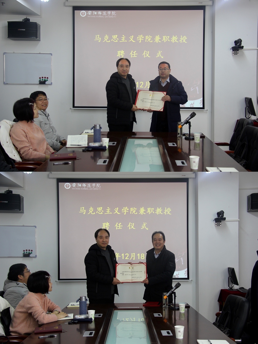12月18日下午,pg电子官方网站兼职教授聘任仪式在勤业楼D502会议室举行,聘任林州市旅游发展委员会杨玉东教授、安阳市殷都区政协副主席靳国庆2位专家为我院兼职教授。