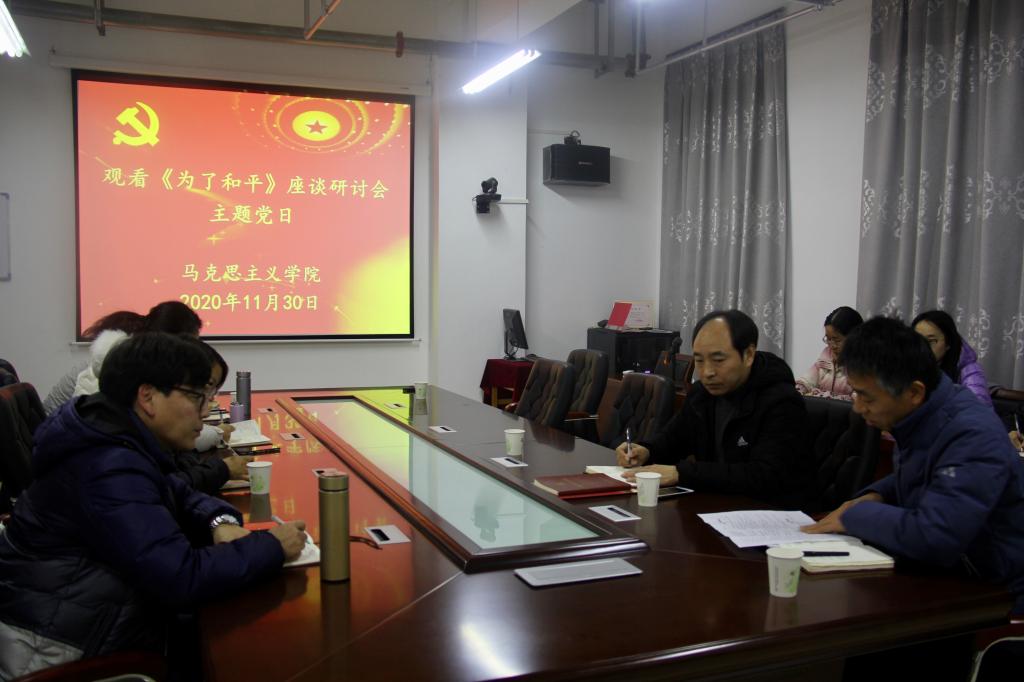 近日,我院在党员活动室开展11月主题党日活动,举办观看《为了和平》座谈研讨会,研讨会由党支部书记韩玉璞主持,全体党员教师参加了座谈研讨。