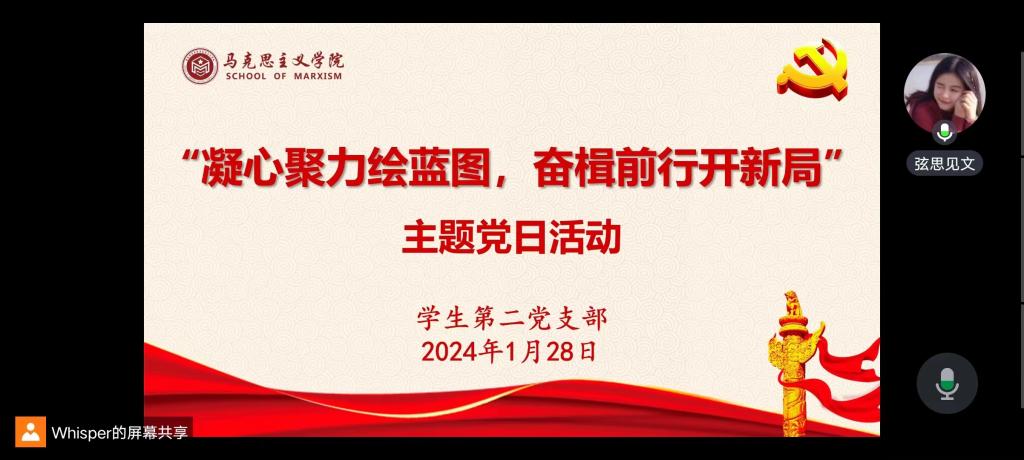 为深入学习习近平总书记重要讲话精神,凝聚全体支部成员,振奋精神勇担使命,扬帆起航奋进新征程,2024年1月28日,我院学生第二党支部以线上的形式召开“凝心聚力绘蓝图,奋楫前行开新局”主题党日活动,本次党日活动由支部书记陈影主持,支部全体成员参加。