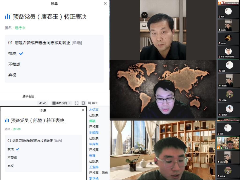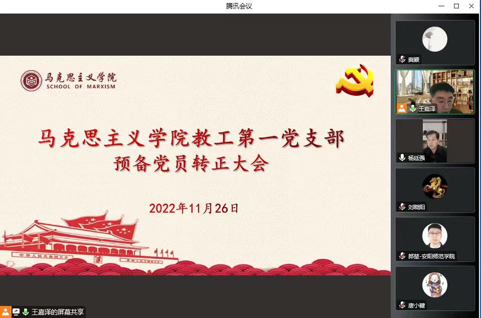 11月26日下午,教工第一党支部通过腾讯会议的形式召开预备党员转正大会。支部23名正式党员,2名预备党员参加了此次会议,会议由支部书记杨廷强同志主持。