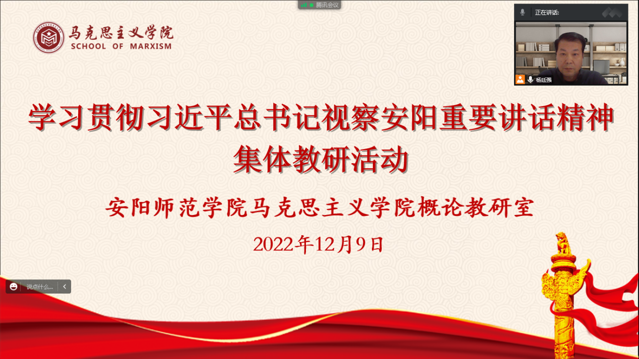 12月9日下午,我院概论教研室以腾讯会议的形式开展学习贯彻习近平总书记视察安阳重要讲话精神集体教研活动。活动由杨廷强主持,概论教研室全体教师参加。