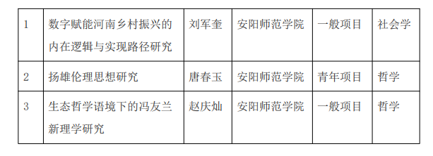 近日,2022年度河南省哲学社会科学规划研究项目评审结果揭晓,我院刘军奎博士主持的《数字赋能河南乡村振兴的内在逻辑与实现路径研究》、唐春玉博士主持的《扬雄伦理思想研究》、赵庆灿博士主持的《生态哲学语境下的冯友兰新理学研究》项目获批立项。