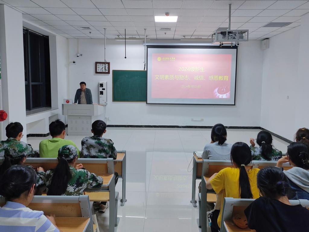 为进一步提升我院学生的文明素养,引导新生学感恩、知诚信、讲励志,9月23日晚,我院于明园一号教学楼123、125召开2024级新生文明素质与励志、诚信、感恩教育讲座。本次讲座由23级辅导员老师毕然主讲,全体2024级学生共同参与。