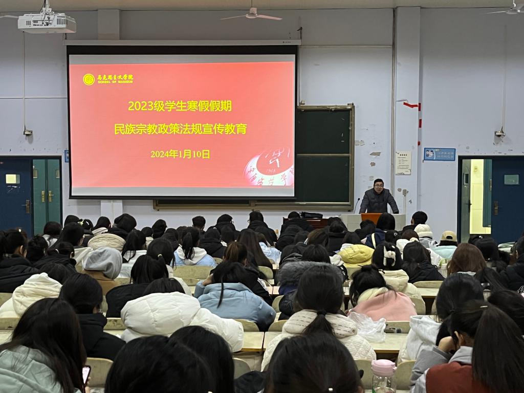 为做好寒假假期民族宗教工作,1月9日-1月11日,我院各年级分别召开寒假假期民族宗教政策法规宣传教育主题班会。学院党委副书记訾彦锋、各年级辅导员主讲,我院各年级学生参与。