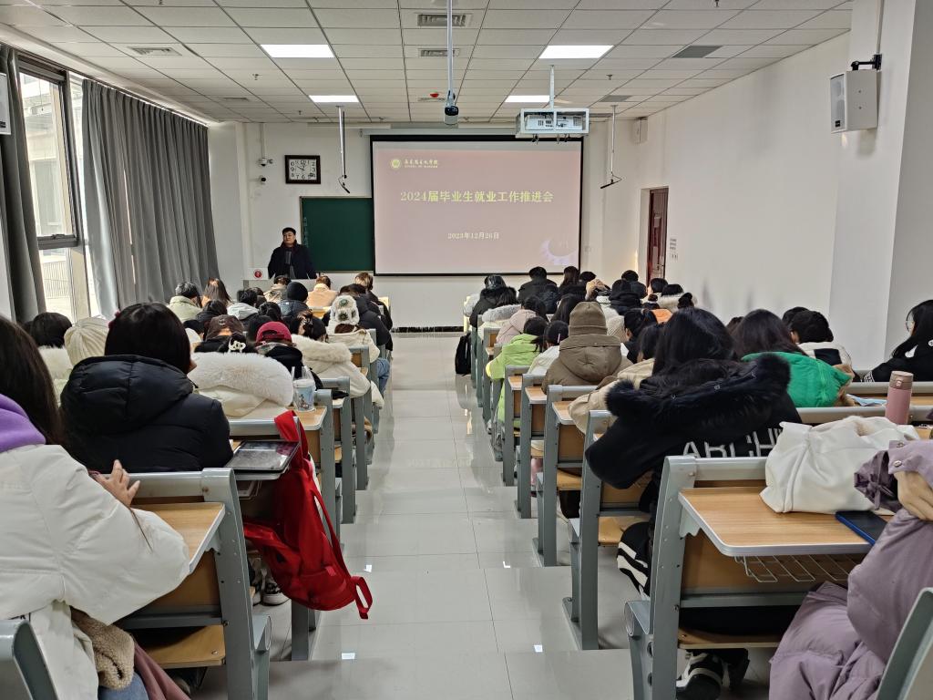 为推进我院毕业生顺利就业,12月26日上午,我院于明园教学楼1号楼215教师举办2024届毕业生就业工作推进会。党委副书记訾彦锋参加,后勤处饮食服务中心主任、学院原学工办主任王国辉以及我院2024届全体毕业生参加。学工办副主任杜梦洁主持会议。