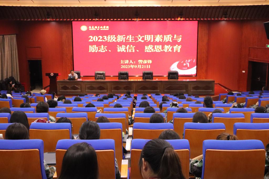 为进一步推进文明校园建设,提升我院学生的文明素养,巩固和深化我院诚信教育成果,营造励志、诚信、感恩的学院氛围,9月21日晚上,我院于勤业楼一楼报告厅开展2023级新生文明素质与励志、诚信、感恩教育讲座。本次讲座由我院党委副书记訾彦锋主讲,2023级全体新生参加。