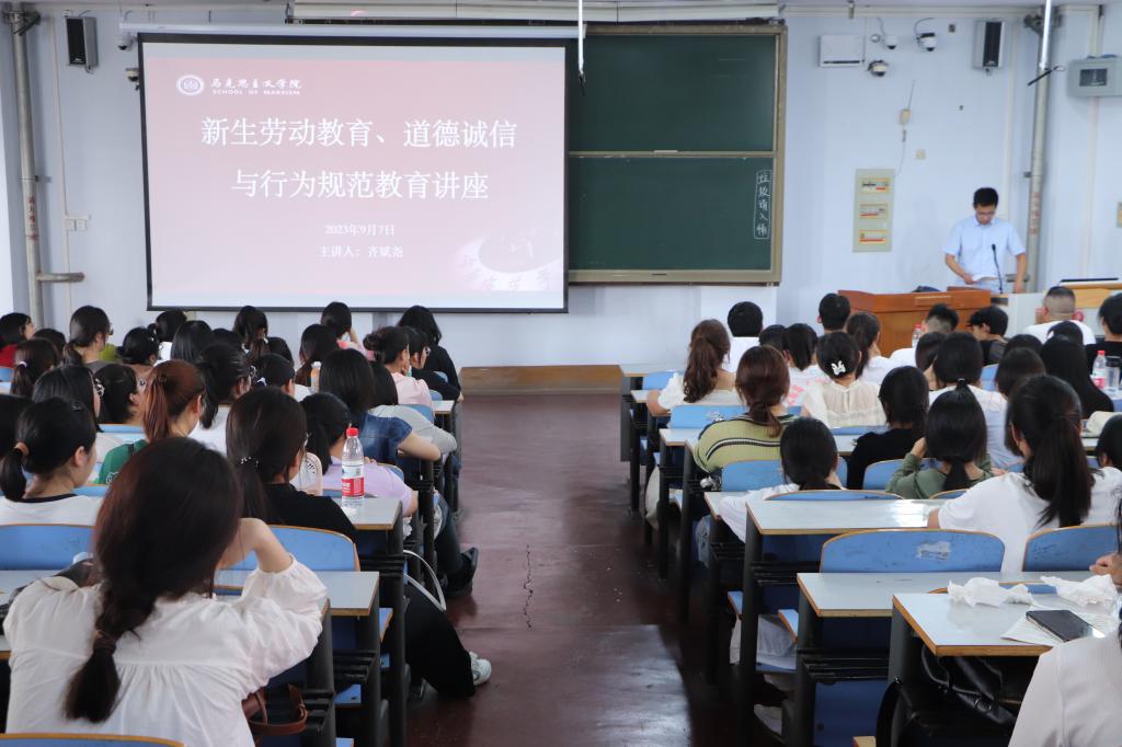 为帮助我院2023级新生树立正确的劳动观点和劳动态度,促进学生综合素质的发展,并扎实推进学生诚信建设与行为规范工作, 9月7日下午,我院开展了劳动教育、道德诚信与行为规范教育专题讲座。讲座由2023级辅导员齐斌尧主讲,2023级全体学生参与。
