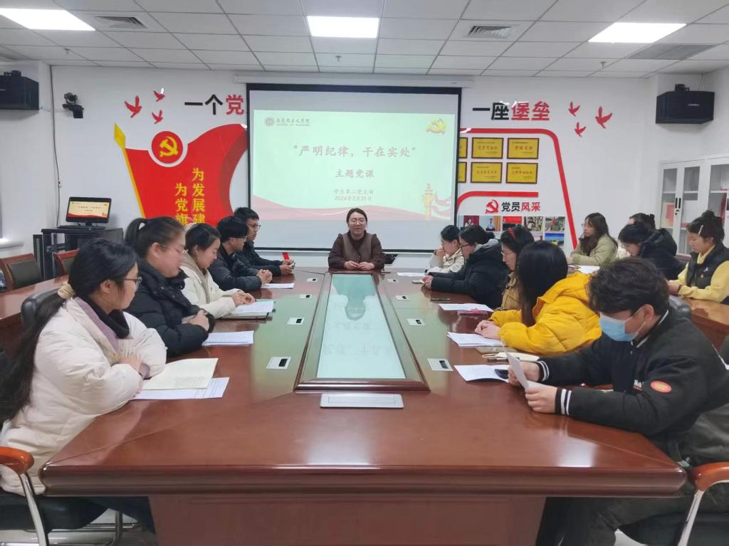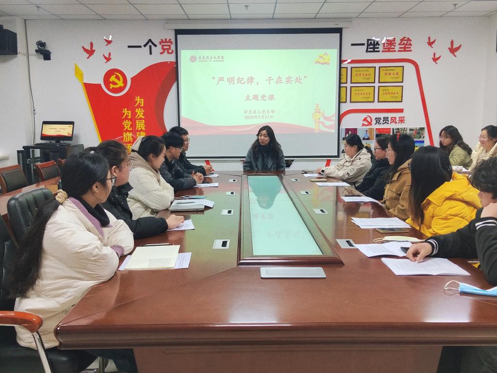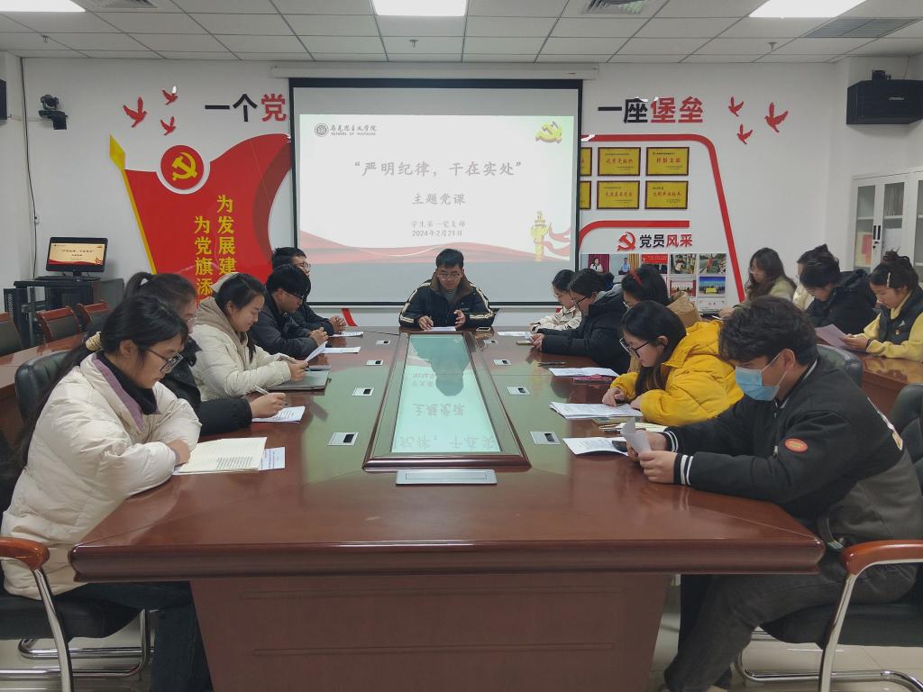 为深入贯彻落实中共中央关于全面从严治党的要求,进一步加强党的纪律建设,pg电子官方网站学生第一、二、三党支部于2025年2月21日下午,在明园3-A502党员之家开展“严明纪律,干在实处”主题党课,本次党课由支部书记主持,支部全体成员共同参加。