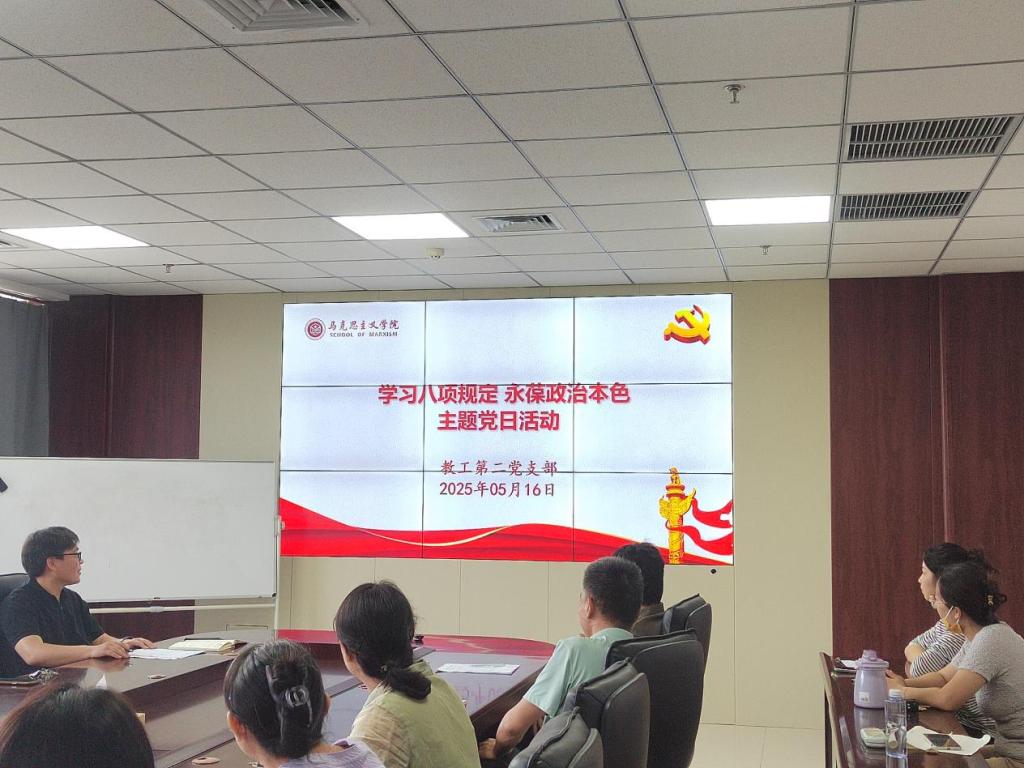 为深入贯彻中央八项规定精神,进一步增强党员干部的党性修养和廉洁自律意识。5月16月,教工第二党支部在明园3A-303会议室组织开展了“学习八项规定 永葆政治本色”的主题党日活动,会议由教工第二党支部书记韩成才同志主持。