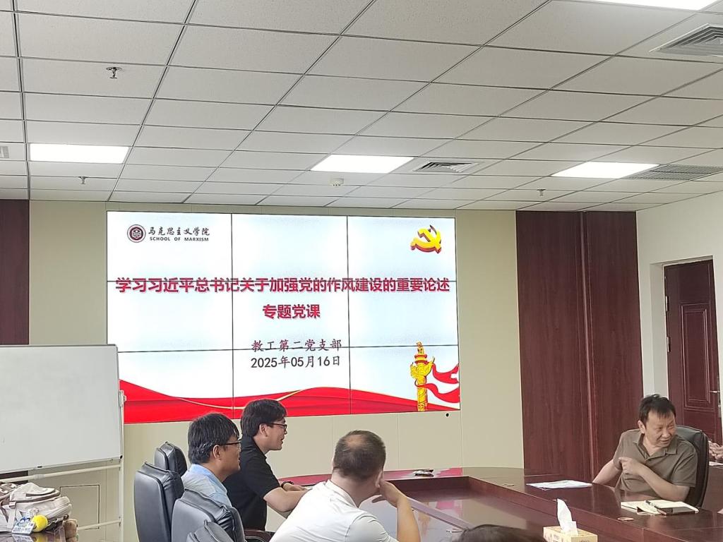 为深入学习贯彻习近平总书记关于加强党的作风建设的重要论述,营造学纪、知纪、明纪、守纪的浓厚氛围,推动广大党员强化遵守纪律的自觉,2025年5月16日,教工第二党支部在明园3A-303会议室组织召开了“学习习近平总书记关于加强党的作风建设的重要论述”主题党课,会议由教工第二党支部书记韩成才主持。