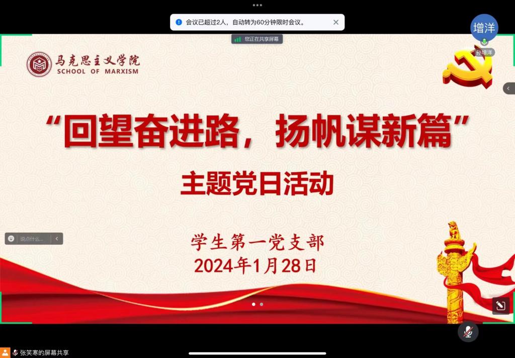 2024年1月28日上午,我院学生第一党支部以线上的形式召开“回望奋进路,扬帆谋新篇”主题党日活动,本次党日活动由支部书记孙增洋主持,支部全体成员参加。
