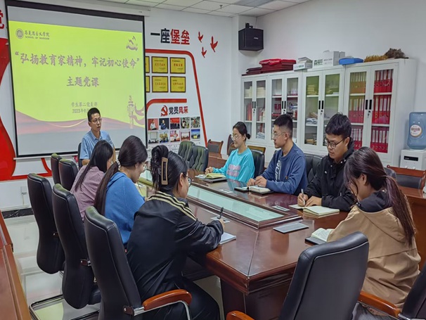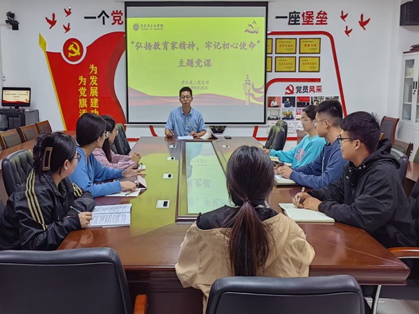 2023年9月25日上午,我院学生第二党支部于明园3-A502党员之家召开“弘扬教育家精神,牢记初心使命”主题党课,本次党课由支部书记齐斌尧主持,支部全体成员参加。