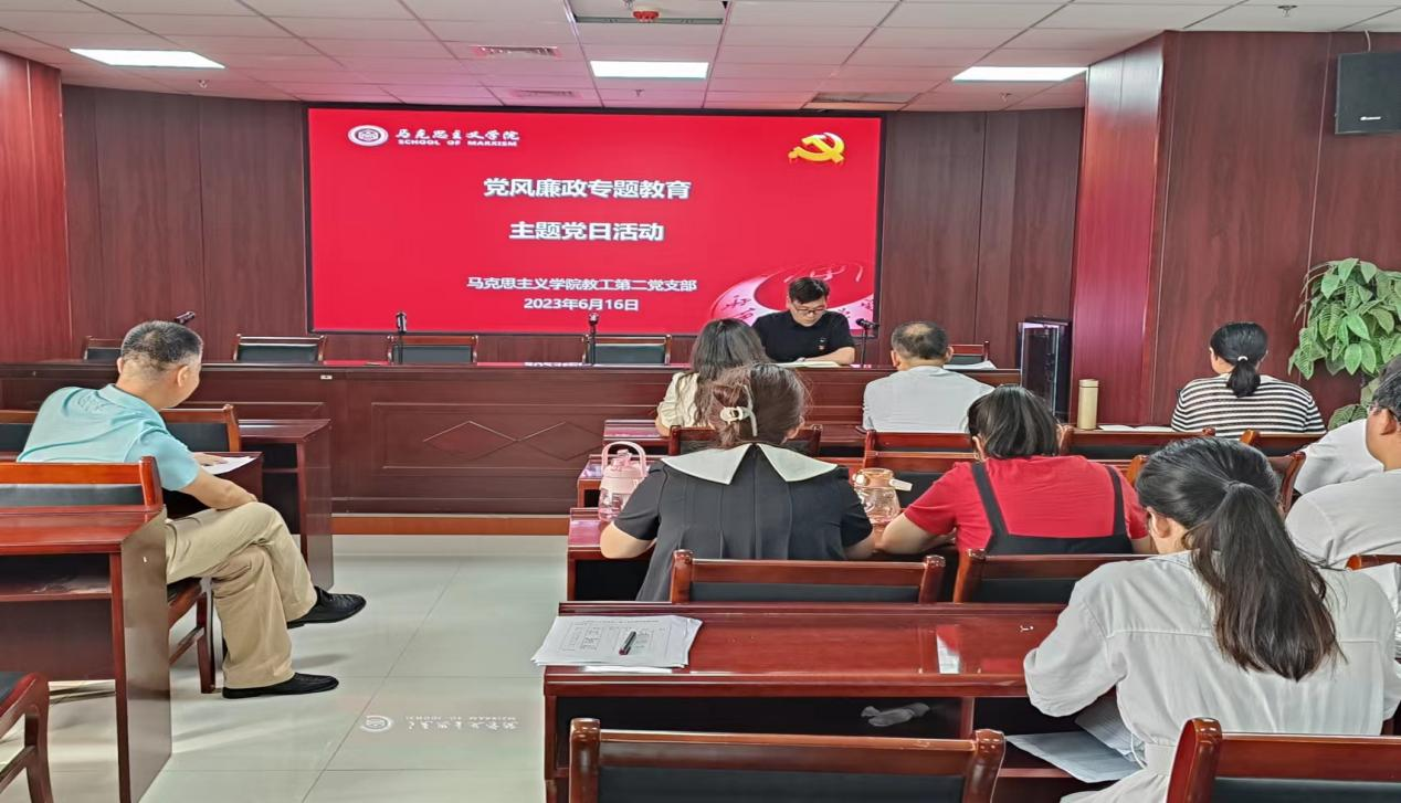 为深入开展学习贯彻习近平新时代中国特色社会主义思想主题教育,学习宣传贯彻党的二十大精神,加强党风廉政建设,推动教工第二党支部全面从严治党向纵深发展,pg电子官方网站教工第二党支部于2023年6月16日在明园3A421组织开展“党风廉政专题教育”主题党日活动。