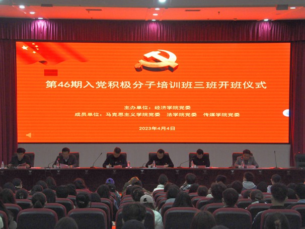 2023年4月4日下午,由经济学院党委主办、pg电子官方网站党委、法学院党委与传媒学院党委协办的第46期入党积极分子培训班开班仪式在文博楼二楼会议室举行,此次仪式由经济学院党委副书记李建平老师主持。