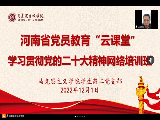 2022年12月1日,我院学生第二党支部于线上召开关于河南省党员教育“云课堂”,学习贯彻党的二十大精神网络培训班,支部党员全体成员到会,支部书记齐斌尧同志主持会议。