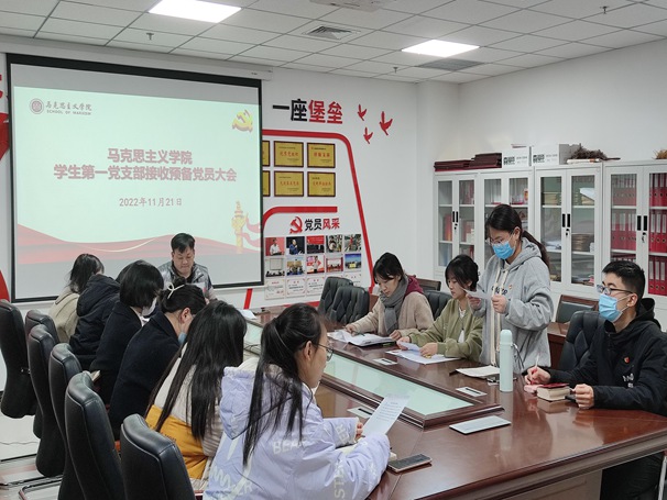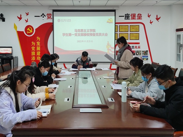 2022年11月21日,我院学生第一党支部在明园3-A502党员之家召开接收预备党员大会,校党委组织部组织员寿继国和支部书记王国辉出席会议,支部全体党员参加。