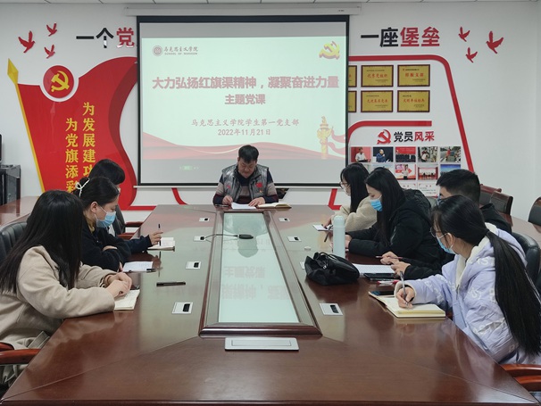 2022年11月21日,我院学生第一党支部书记王国辉以“大力弘扬红旗渠精神,凝聚奋进力量”为主题,在明园3-A502党员之家,为学生第一党支部全体党员上了一次主题党课。