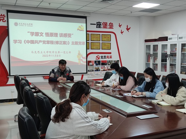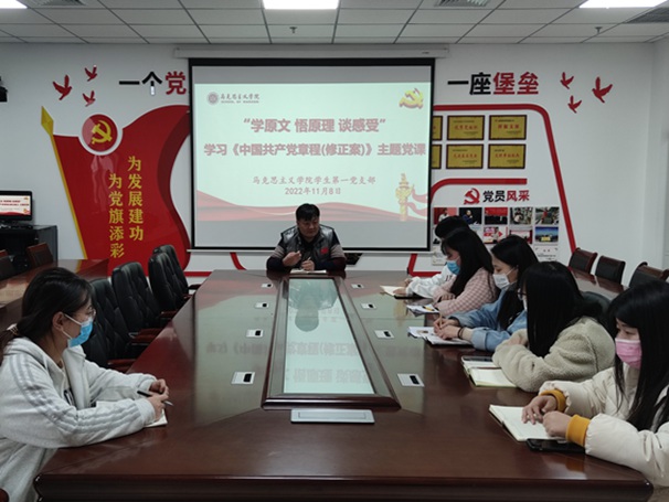 为全面学习领悟党章修正案核心要义,2022年11月8日下午,我院学生第一党支部书记王国辉以“学原文 悟原理 谈感受”为主题,在明园3-A502党员之家,为学生第一党支部全体党员上党课。