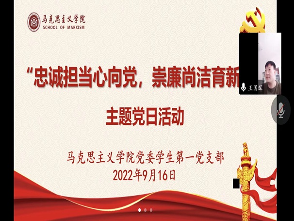 2022年9月16日上午,pg电子官方网站学生第一党支部于线上召开“忠诚担当心向党,崇廉尚洁育新风”主题党日活动, 本次党日活动由支部书记王国辉同志主持,学生第一党支部全体成员参加。