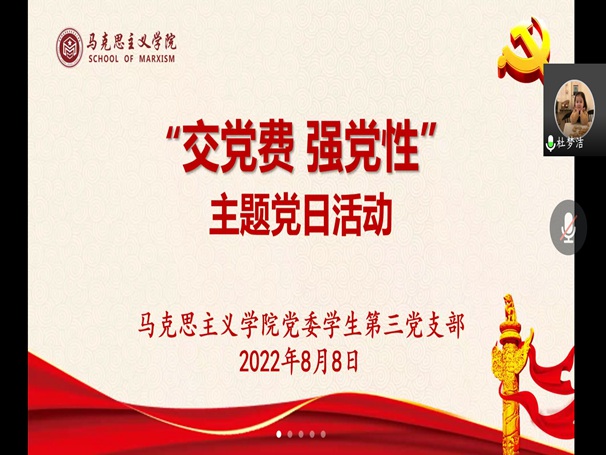 为进一步规范党的组织生活,推动广大党员的思想从“收”党费向“交”党费转变,让交纳党费成为党员的一种思想自觉和行动自觉。8月8日,pg电子官方网站学生第三党支部采用线上学习的方式,开展了以“交党费 强党性”为主题的党日活动。此活动由支部书记杜梦洁主持,学生第三党支部全体党员参加。