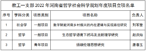 2022年8月2日,河南省哲学社会科学工作事务中心发布2022年河南省哲学社会科学规划年度项目立项名单,教工第一党支部三位教师申报的项目获批立项。