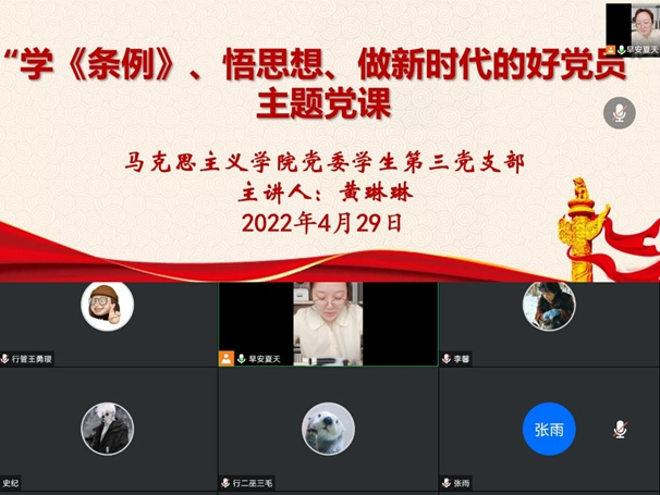为进一步贯彻落实《中国共产党普通高等学校基层组织工作条例》,4月29日,我院学生第三党支部在腾讯会议上开展了“学《条例》、悟思想、做新时代的好党员”主题党课。党课活动由党支部书记黄琳琳主持,支部全体党员参加。