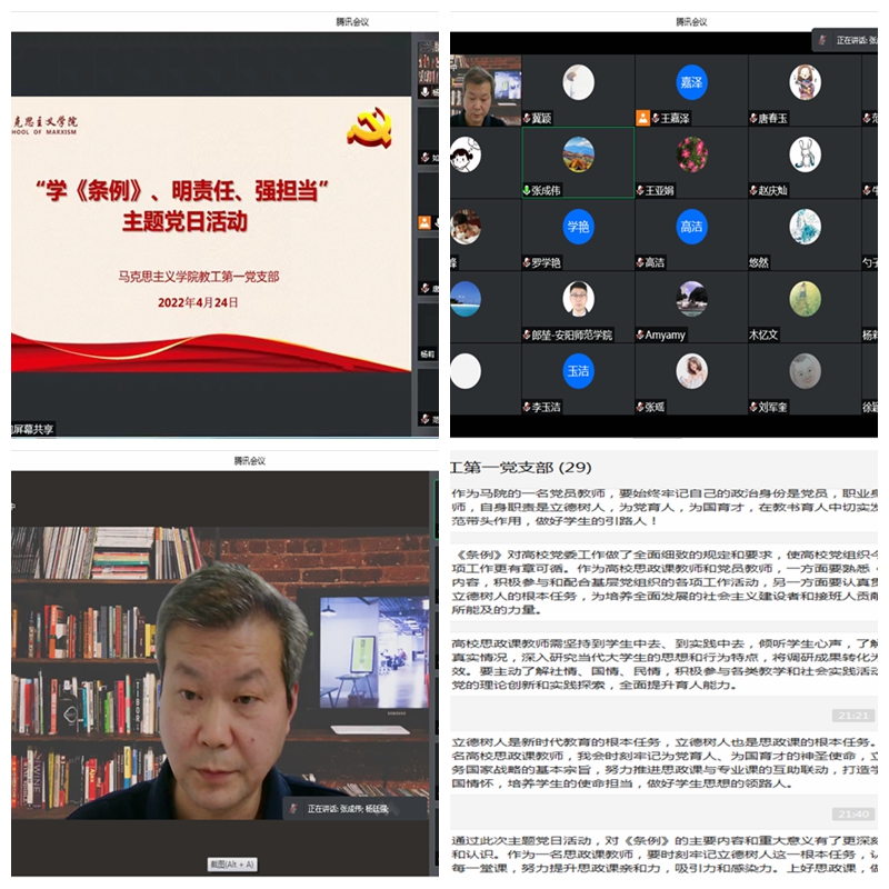 为进一步学习贯彻《中国共产党普通高等学校基层组织工作条例》,4月24日,我院教工第一党支部以腾讯会议的形式,开展了“学《条例》、明责任、强担当”主题党日活动。活动由党支部书记杨廷强主持,支部全体党员参加。