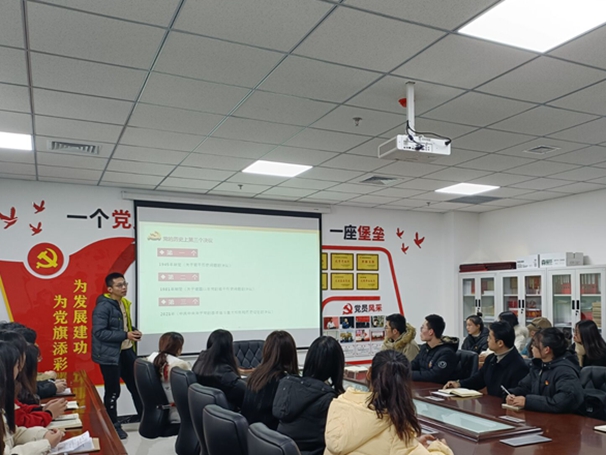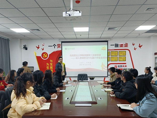 为全面学习领会党的十九届六中全会精神,2021年12月10日下午,我院学生第二党支部书记齐斌尧以“学习贯彻党的十九届六中全会精神”为主题,在明园3-A502党员之家,为学生第二党支部全体党员上主题党课。