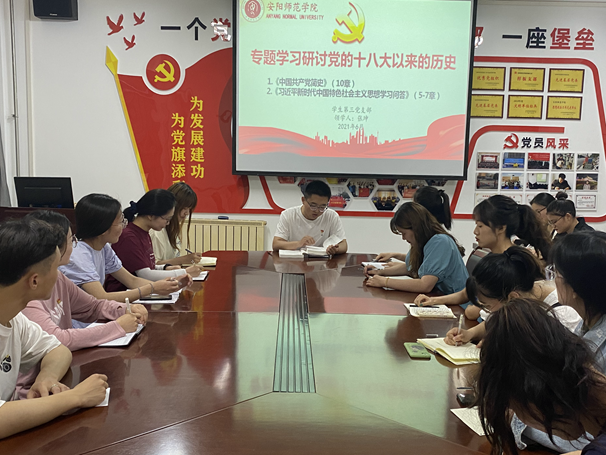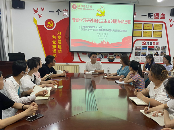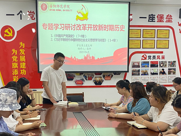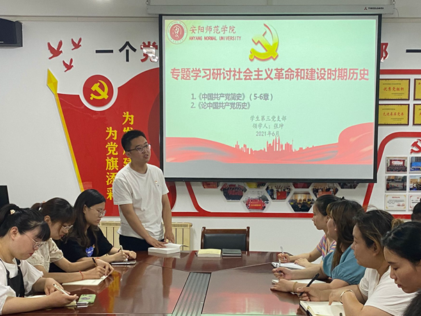 2021年5月底和6月初,我院学生第三党支部书记张珅同志带领学生第三党支部,于逸夫楼1028党员之家先后开展了四次党史学习教育专题学习研讨会,学生第三党支部全体成员参加。