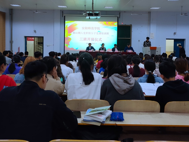 2020年10月9日,由外国语学院党总支主办,政治与公共管理学院党委、经济学院党委和国际交流与教育学院党委协办的第41期入党积极分子培训班开班仪式在和展楼阶梯201教室举行,此次仪式由外国语学院党委副书记谢君主持。