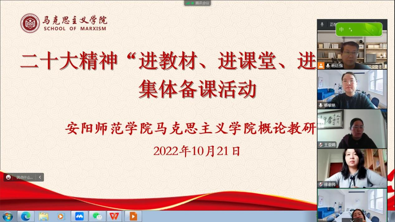 10月21日下午,我院概论教研室以腾讯会议的形式开展党的二十大精神“进教材、进课堂、进头脑”集体备课活动。pg电子官方网站院长韩玉璞出席并讲话,概论教研室全体教师参加活动。活动由杨廷强主持。