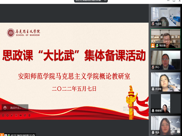 2022年5月7日下午,概论教研室通过腾讯会议在线上举行思政课“大比武”集体备课活动。活动由概论教研室主任杨廷强主持,概论教研室全体教师参加了本次活动。