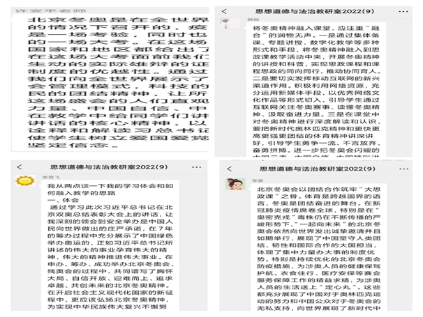 教研室老师一致认为,北京冬奥会是在全世界遭受疫情冲击的情况下召开的,在疫情面前我们国家交出了满意答卷,这是我们国家综合国力不断提升的重要体现,同时北京冬奥会、冬残奥会的成功举办离不开党的坚强领导,它以生动的事实证明了社会主义制度具有独特优越性。最后各位老师还从科技强国、文化自信以及社会管理能力等角度进行相关论述。