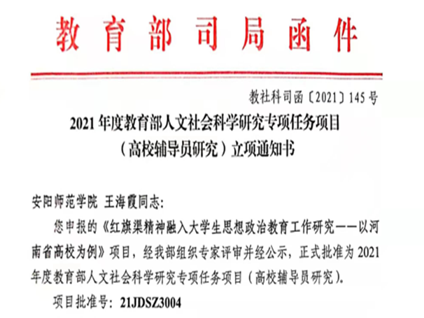 近日,教育部社科司发布了《教育部社科司关于2021年度教育部人文社会科学研究一般项目立项的通知》,我院王海霞副书记申报的“红旗渠精神融入大学生思想政治教育工作研究——以河南省高校为例”获得立项,立项号“21JDSZ3004”,获批经费2万元。