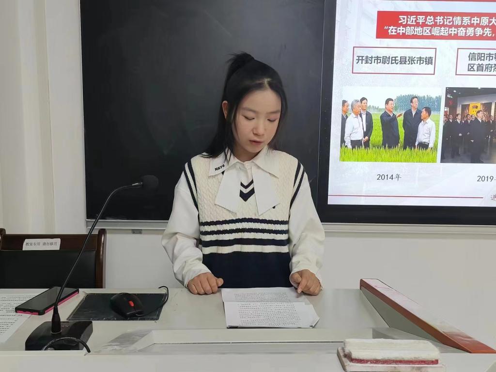 本次宣讲活动分为走进院系、走进支部以及走进社团三场。宣讲活动中,王晓晴以“厚植文化底蕴,传承安阳文化,铸就出彩河南”为主题,以安阳深厚的历史底蕴为出发点,结合自身红旗渠暑期社会实践活动成长经历,深刻讲述了传承好、发扬好安阳文化的重要意义。同时,她强调了青年一代要勇担文化使命,增强文化自信,厚植文化底蕴,续写文化华章,传承文化根脉,并激励在座学子牢记嘱托,挺膺担当,以奋斗之姿激扬青春。温家宁则是以习近平总书记在党的二十大报告中明确提出:“从现在起,中国共产党的中心任务就是团结带领全国各族人民全面建成社会主义现代化强国、实现第二个百年奋斗目标,以中国式现代化全面推进中华民族伟大复兴。”为切入点,带领在座青年深刻领悟中国式现代化的内涵和意义,呼吁大家要坚定志不改、道不变的决心,坚持中国特色社会主义道路,以中国式现代化全面推进中华民族伟大复兴,踔厉奋发、勇毅前行,创造无愧于党、无愧于人民、无愧于时代的新业绩,赢得更加伟大的胜利和荣光。