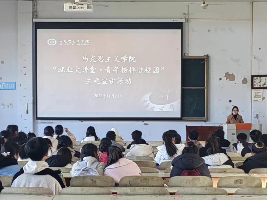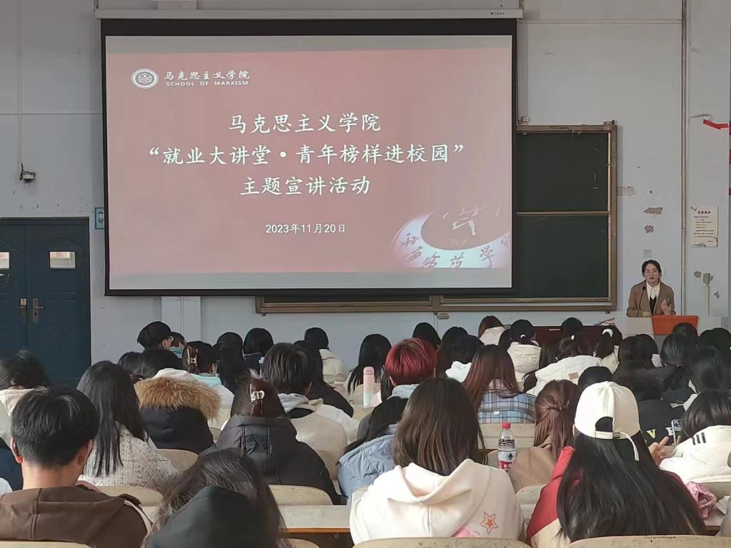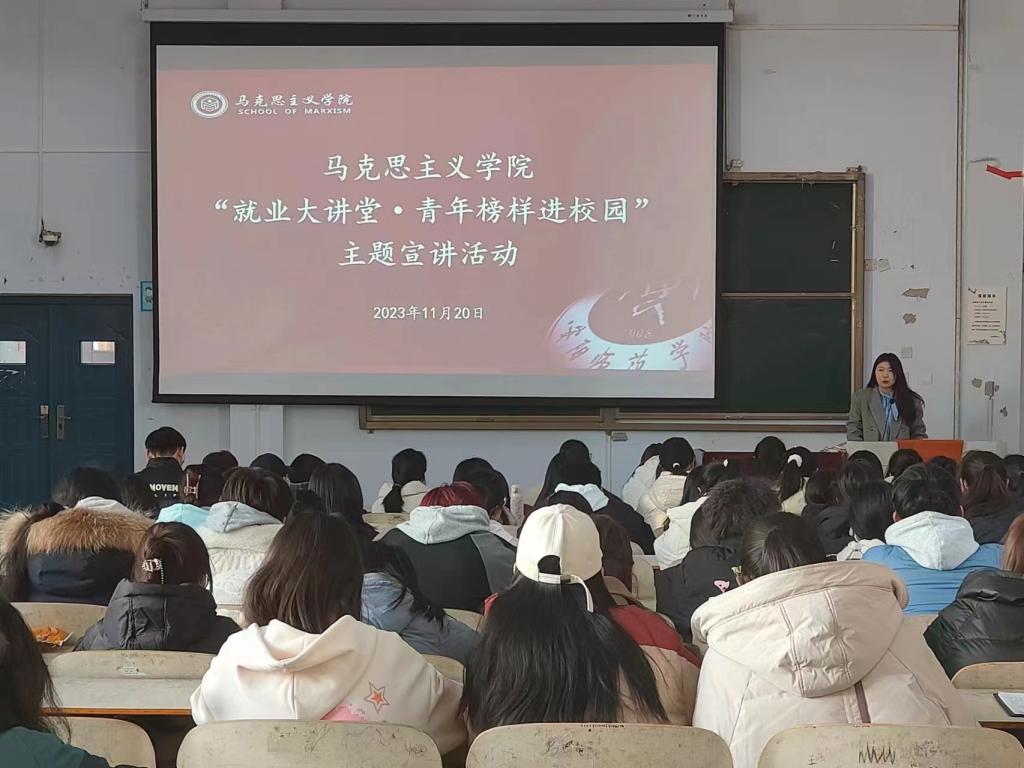 为引导我院团员和青年学生积极在强国建设、民族复兴伟业中挺膺担当,11月20日、11月23日,我院分别于和展阶梯301、和展阶梯302开展“就业大讲堂·青年榜样进校园”主题宣讲活动。本次主题宣讲活动由青年榜样胡奇瑶、周洁、赵梓如主讲,我院团学骨干成员参与。