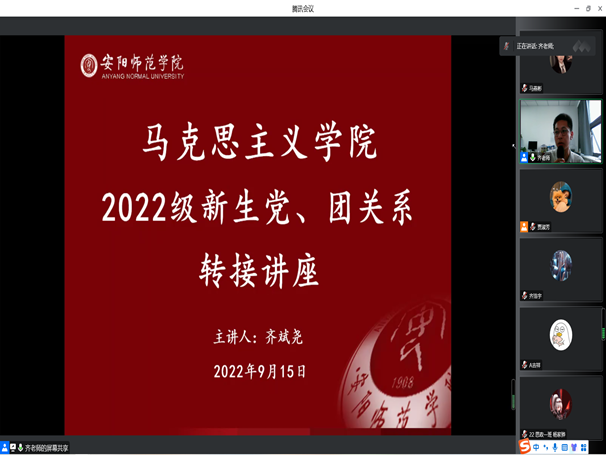 为顺利开展我院2022级新生党、团关系转接工作,9月15日,我院于线上开展新生党、团关系转接讲座。本次讲座由我院分团委负责人齐斌尧主讲,22级全体新生参加。
